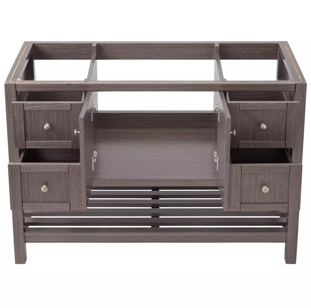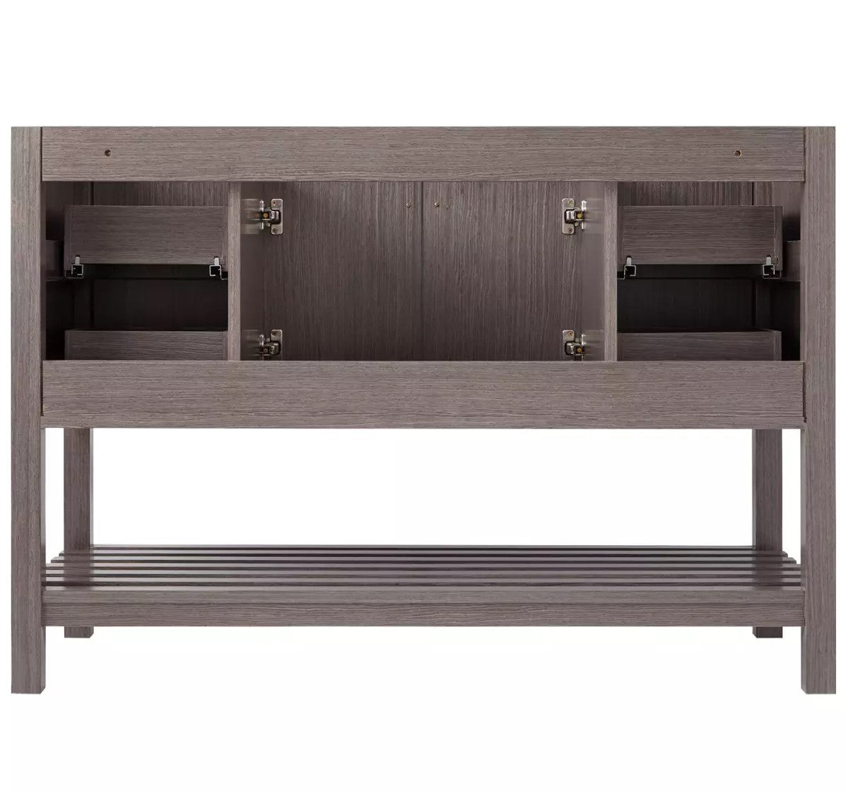 The 48" Everett Console Vanity is designed to keep your toiletries conveniently within reach. Stacked drawers surround a spacious middle area, which is protected by double doors. A slatted shelf spans the length of the cabinet, providing plenty of room for towels and linens.